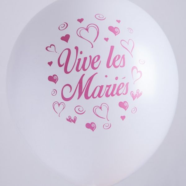 Ballons 12" - Imprimé 1 Face Vive les Mariés Rose et Blanc - Sachet Cavalier de 10